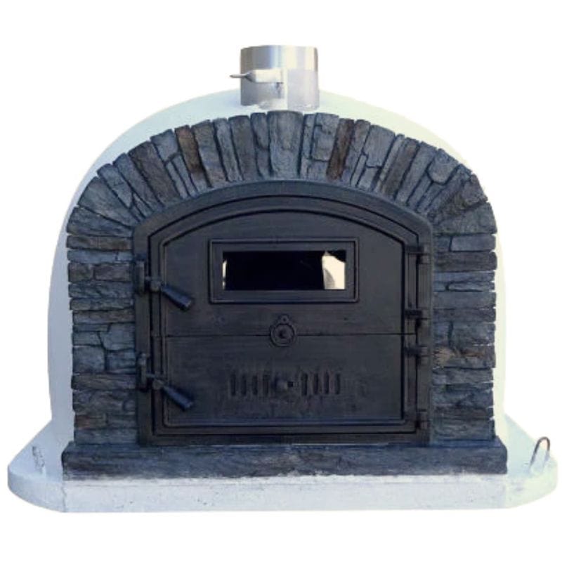 The traditional brick ovens have a STAINLESS STEEL chimney flue system and an IRON door. The premium ovens have an upgraded high-quality ALUMINUM chimney flue system and a black NON-RUST ALUMINUM door showcasing a high-heat window pane.
