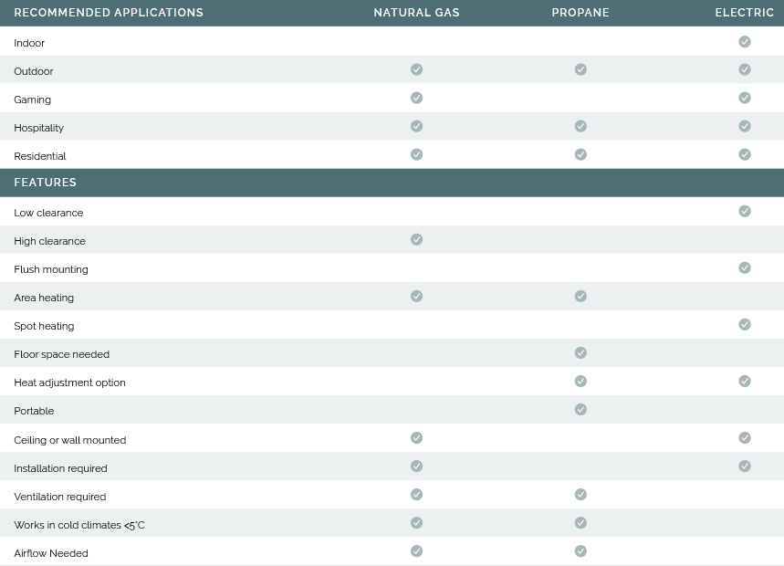 Choose from three fuel source configurations - Natural Gas, Propane, or Electric - to find the perfect heater for your needs. With options in both ceiling or wall mounted and floor models, we have a variety of sizes for patio heating!  See the pros and cons of each heater type below the collection.