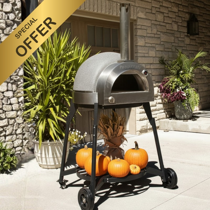 The L’Argilla comes complete with a heavy-duty wheeled stand with rear locking casters, a solid stainless steel door with a stay-cool handle, a built-in ambient thermometer, and stainless steel chimney.