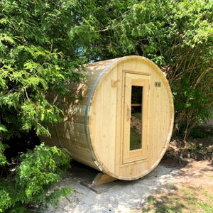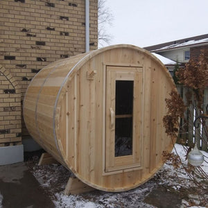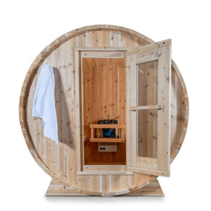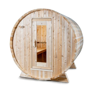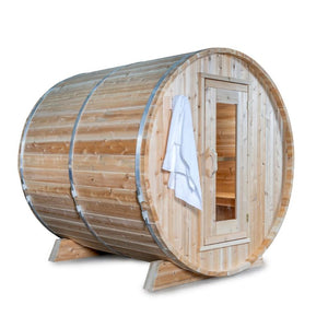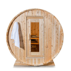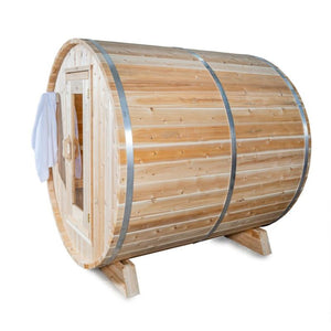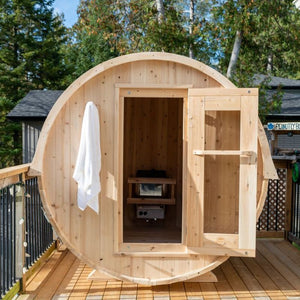 Experience cozy, at-home relaxation with the LeisureCraft Canadian Timber Harmony Barrel Sauna that fits 3-4 people. Handcrafted from sustainably sourced Eastern White Cedar, it offers natural durability, a light wood tone, and a traditional outdoor sauna feel.