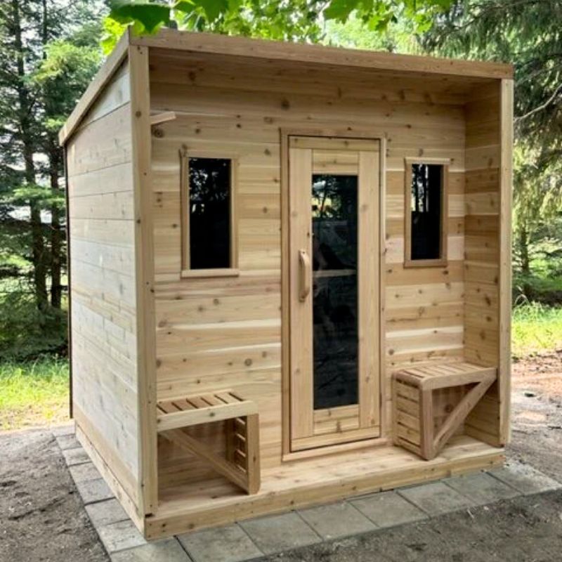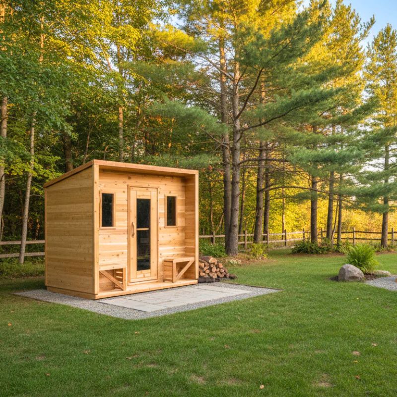 Outdoor models range from compact 6' barrels to larger cube-style saunas. As a guideline, allow 2 ft of bench space per person.